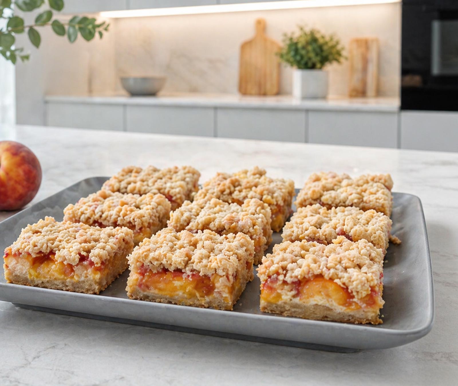 Preprosta, a bogata sladica, kjer se popolno prepletajo hrustljava podlaga, kremna sredica in sočne breskve – idealna za vsako priložnost.