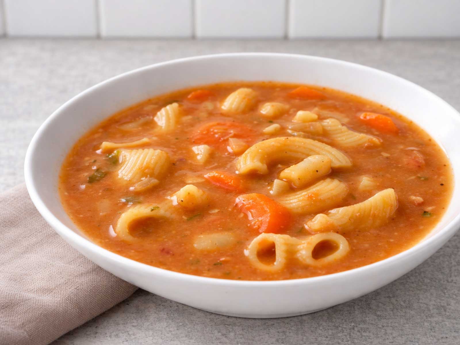 Dodatek vina, paradižnikove mezge in zelišč poskrbi za prijetno globino okusa, testenine pa juho lepo zaokrožijo in ji dajo domač značaj.