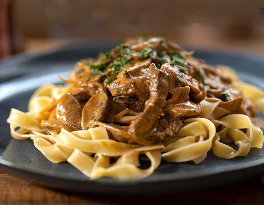 Goveji stroganoff je klasična ruska jed, ki jo obožujejo po vsem svetu. Tanko narezani trakovi govejega fileja v kombinaciji s kremasto gobovo omako, obogateni s kislo smetano in dišečimi začimbami, ustvarijo okusno, kremasto jed, ki se odlično poda k jajčnim rezancem ali rižu.