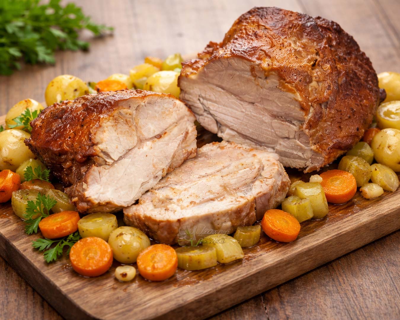 Svinjska vratovina je idealna za počasno peko, saj vsebuje ravno prav maščobe, ki med pečenjem topi meso in ustvarja naravno, bogato omako brez dodatkov.
