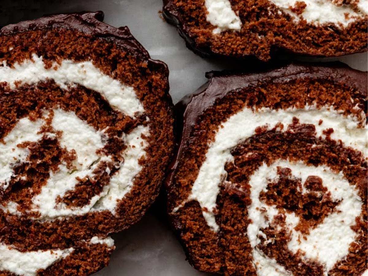 Popolnoma rahla in puhasta čokoladna rolada, napolnjena z vaniljevo stepeno smetano in oblita z bogatim čokoladnim ganachejem. Ta sladica je odličen zaključek vsakega obroka.