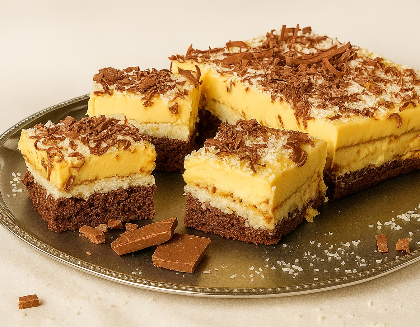 Če iščete sladico, ki je hkrati elegantna, kremna in izjemno preprosta za pripravo, potem je to pecivo popolni zadetek. Sestavljeno je iz treh plasti: mehka čokoladna osnova v stilu brownija, sočna kokosova sredina in svilnata vanilijeva krema, ki v kombinaciji ustvarijo pecivo, kot iz vrhunske slaščičarne.
