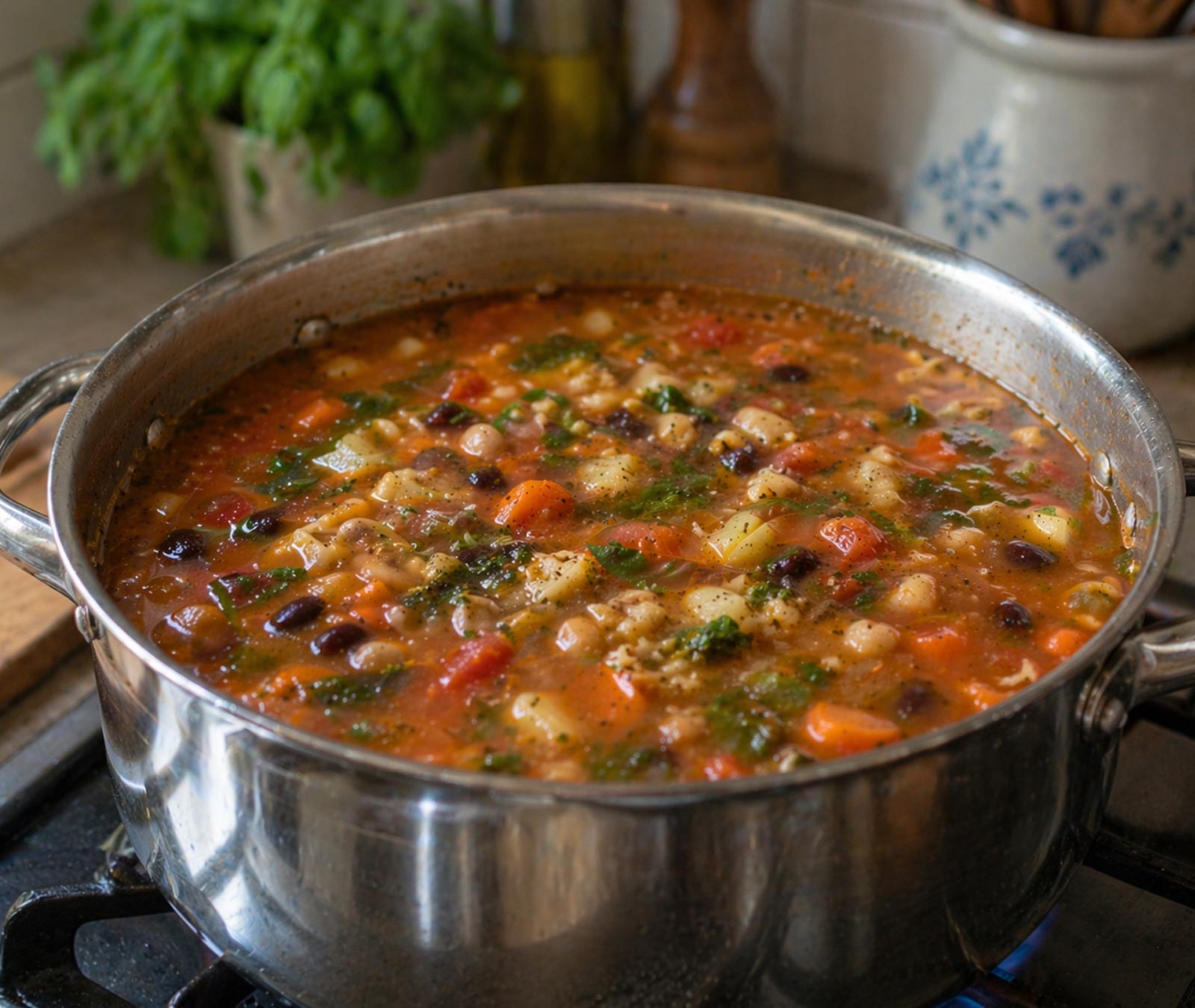 - Ko zavre, zmanjšajte temperaturo in pustite, da juha počasi vre približno eno uro oziroma dokler stročnice ne postanejo mehke.