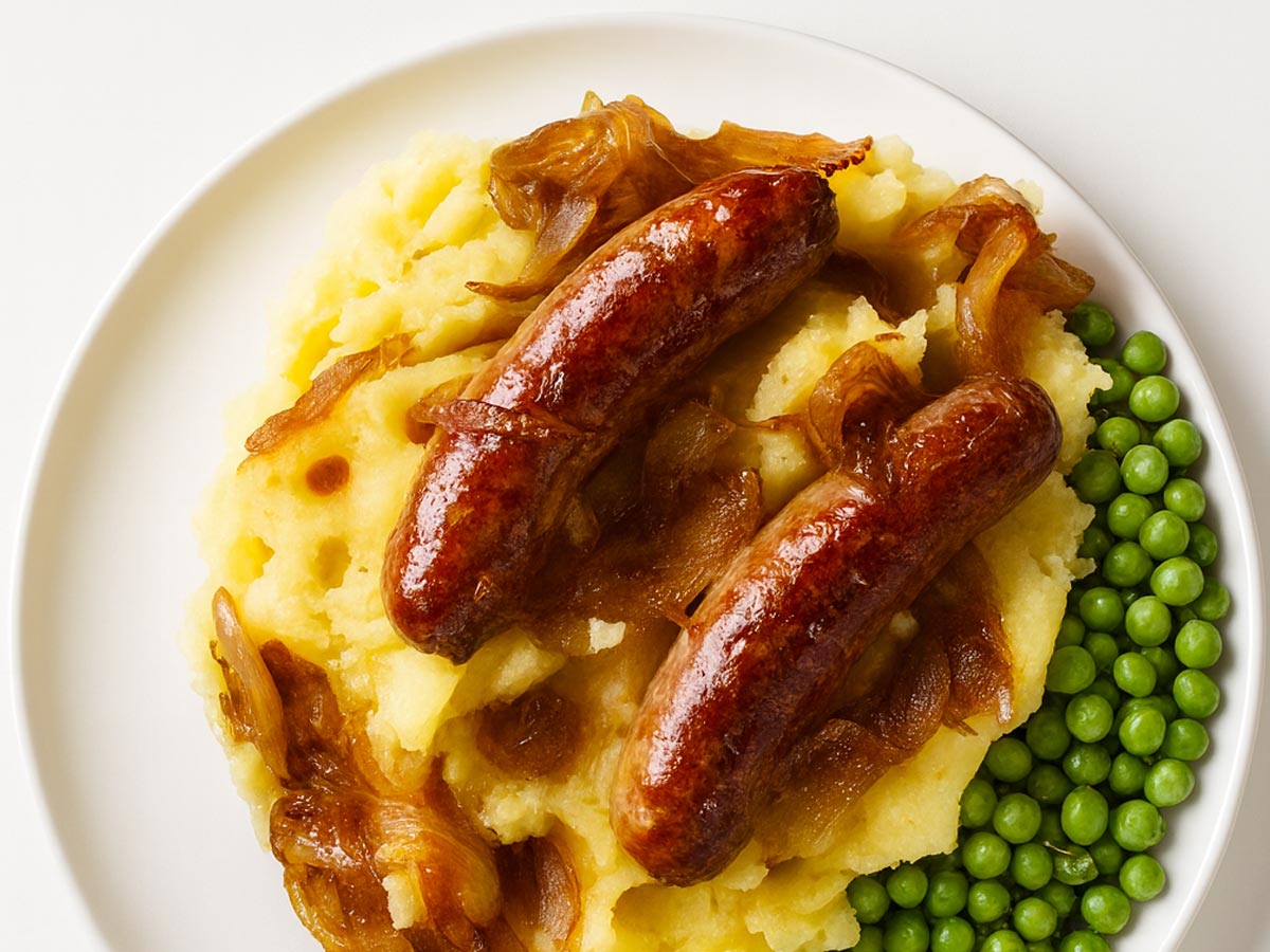 Ko želite klasično jed, ki nasiti celo družino, so pečene klobase s pire krompirjem prava izbira. Sočen pire, sladka čebulna omaka in svež grah naredijo to jed popolno za hladne dni ali nedeljsko kosilo.