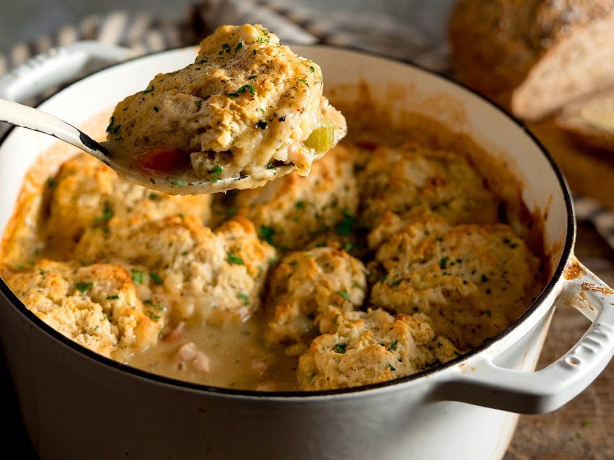 Okusna, kremasta piščančja enolončnica z mehko zelenjavo in puhastimi sirovimi cmoki je popolna jed za hladnejše dni.