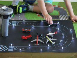 Letališče iz škatle za pico z delujočimi pristajalnimi lučmi