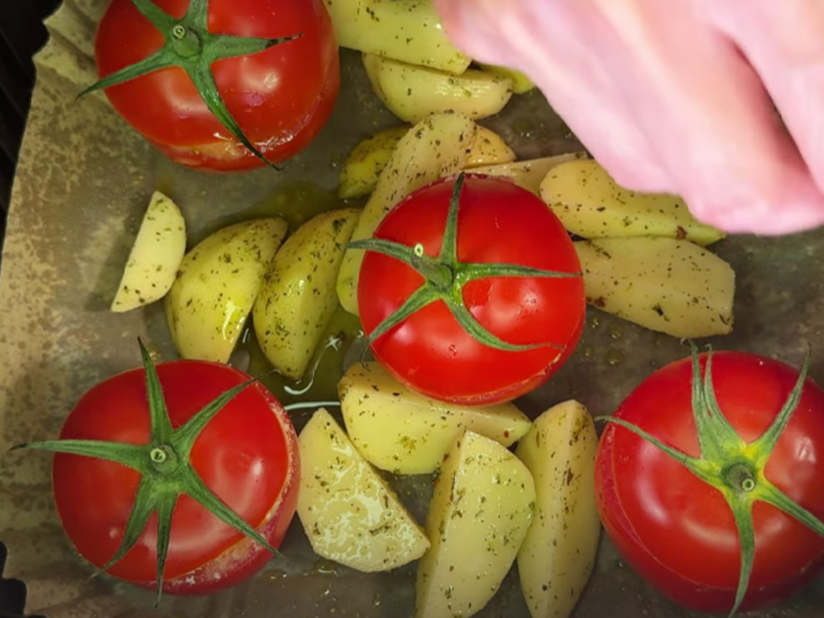 - Dodajte krompir – Mladi krompir narežite na polovice, začinite z italijanskimi zelišči in olivnim oljem, nato ga razporedite okoli paradižnikov.