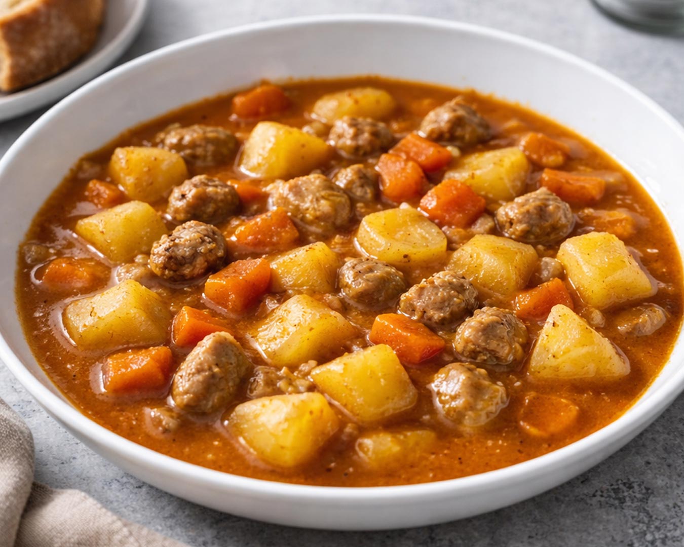 - Nasvet: enolončnico med kuhanjem večkrat močneje premešajte, da krompir lažje sprosti škrob in naravno zgosti jed.