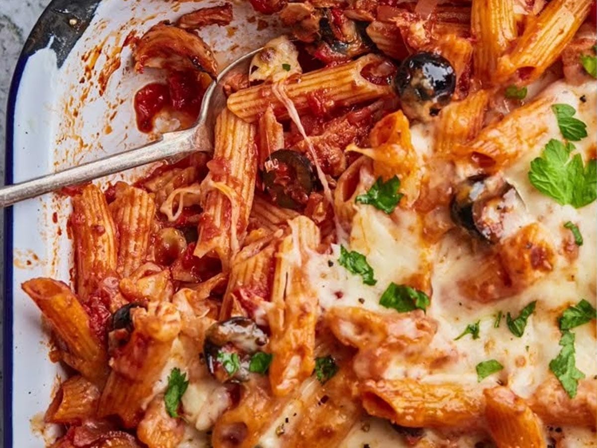To okusno pečeno testeninsko jed, polno bogatih sredozemskih okusov, lahko pripravite za kosilo ali večerjo. S kombinacijo tune, pečenih paprik, oliv in sira je to jed, ki bo navdušila vsakogar za mizo.