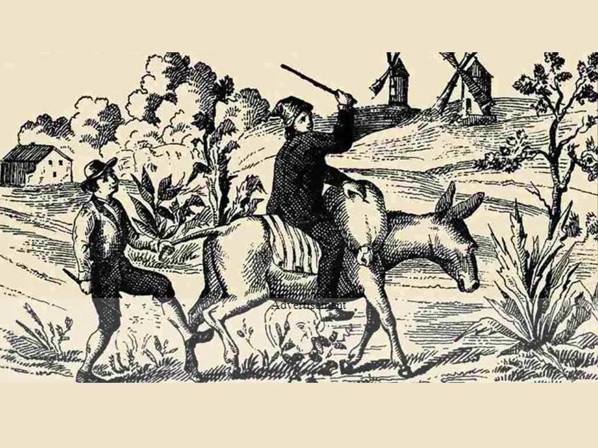 Na prvi pogled se zdi, da optična iluzija prikazuje preprost prizor – kmet jaha osla, poleg njega pa stoji drugi mož, ki drži živalski rep. Okolica je tipično podeželska: grmičevje, drevesa, hiša in vetrnice v ozadju. Toda to ni navadna slika, saj se v njej skrivajo še druge oblike.