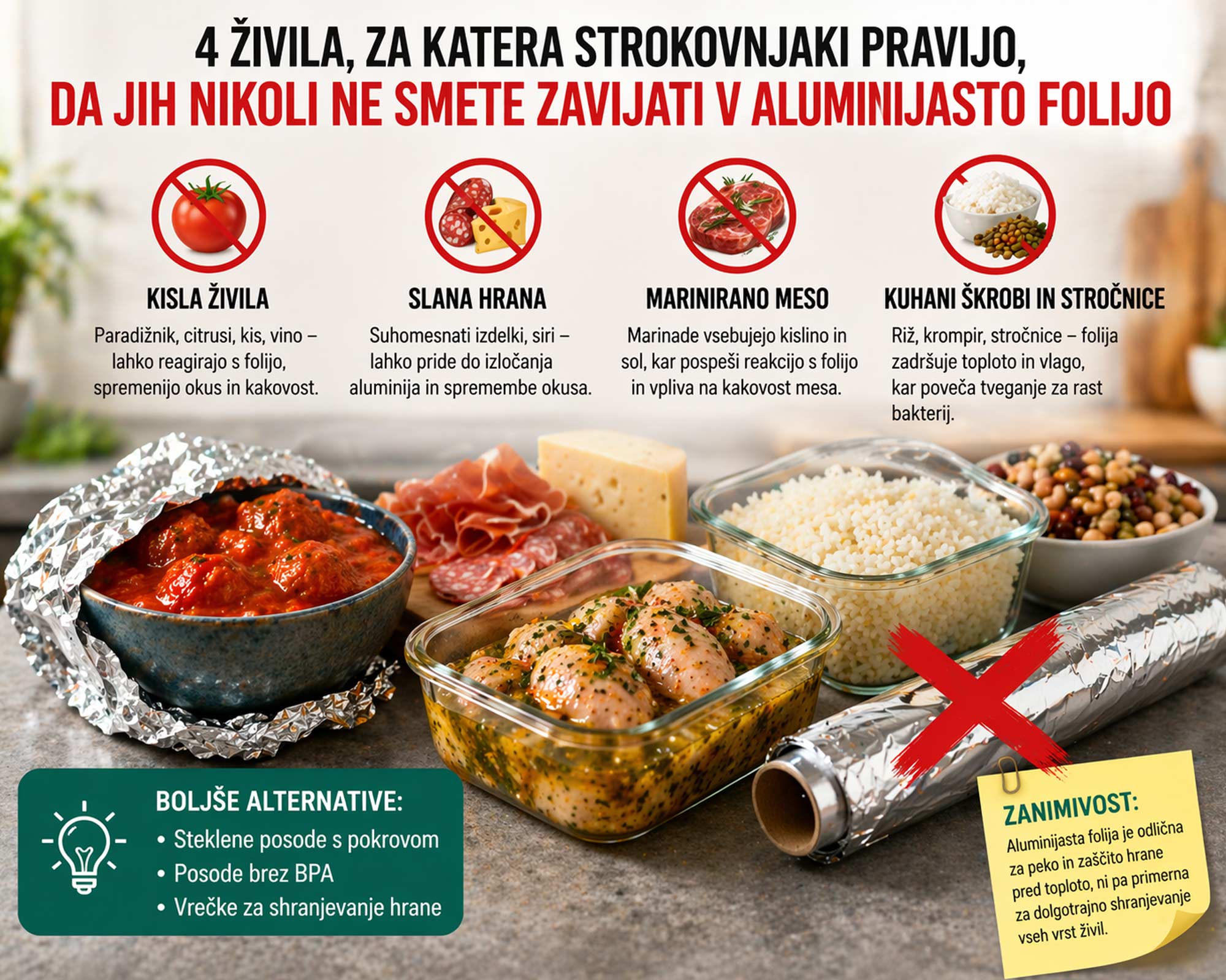 Aluminijasta folija je nepogrešljiv kuhinjski pripomoček, vendar ni vedno najboljša izbira za shranjevanje hrane. Čeprav jo pogosto uporabljamo brez razmisleka, lahko pri določenih živilih povzroči spremembo okusa, kakovosti ali celo poveča tveganje za razvoj bakterij.