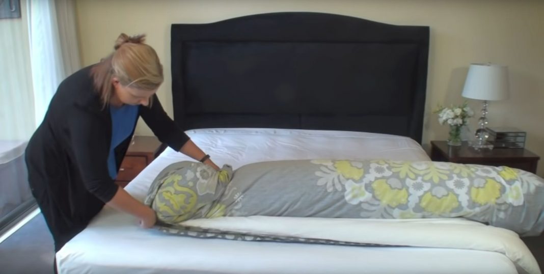 Da, res je tako enostavno obleči prešito odejo (kovter). Namesto da prevleko (kapno) poveznete čez odejo, uporabite postopek iz videa, kjer zvijete tako prevleko kot odejo kot rolado. Z majhnim trikom kapno obrnete – ko “rolado” spet odvijete, bo prešita odeja sveže oblečena.