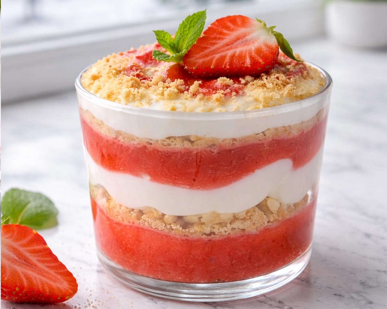 Včasih si zaželite sladico, ki je pripravljena hitro, brez pečice in brez zapletenih postopkov – a je kljub temu videti kot iz slaščičarne. Ta jagodna sladica v kozarcu je točno takšna. Združuje nežno mascarponejevo kremo, osvežilen jagodni pire in plast hrustljavih piškotov, ki poskrbijo za popolno ravnovesje tekstur.
