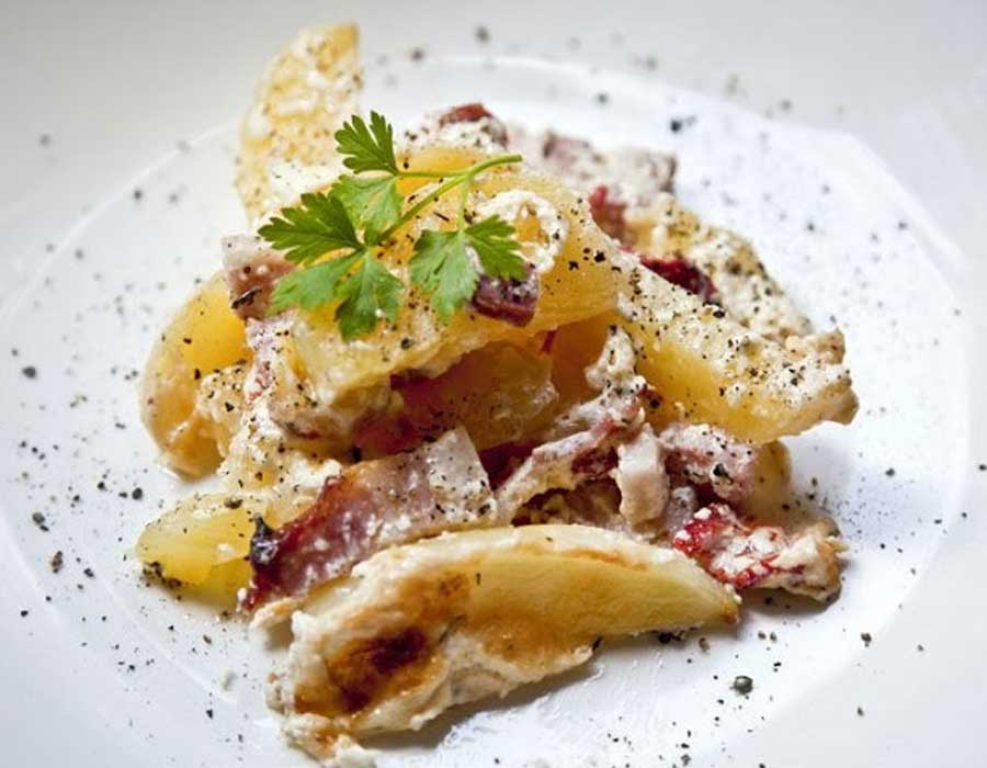 - Krompir damo v večjo skledo, posolimo, dodamo sušen rožmarin, narezano slanino in papriko.