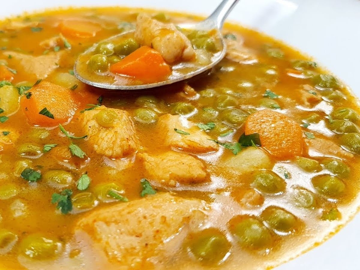 - Po 10 minutah dodamo zamrznjen grah in krompir. Začinimo s suho mešanico začimb in paradižnikovim koncentratom, dobro premešamo in dodamo lovorov list. Pustimo 5 minut.