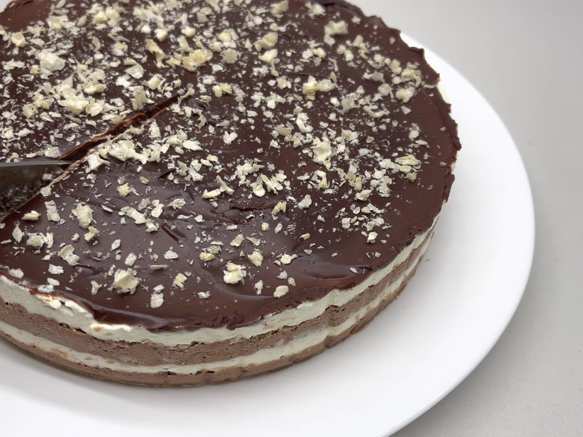 - Pripravite preliv. Uporabite 100 g temne čokolade, ki jo stopite in 100 g tople sladke smetane, zmešajte skupaj in prelijte čez ohlajeno torto.