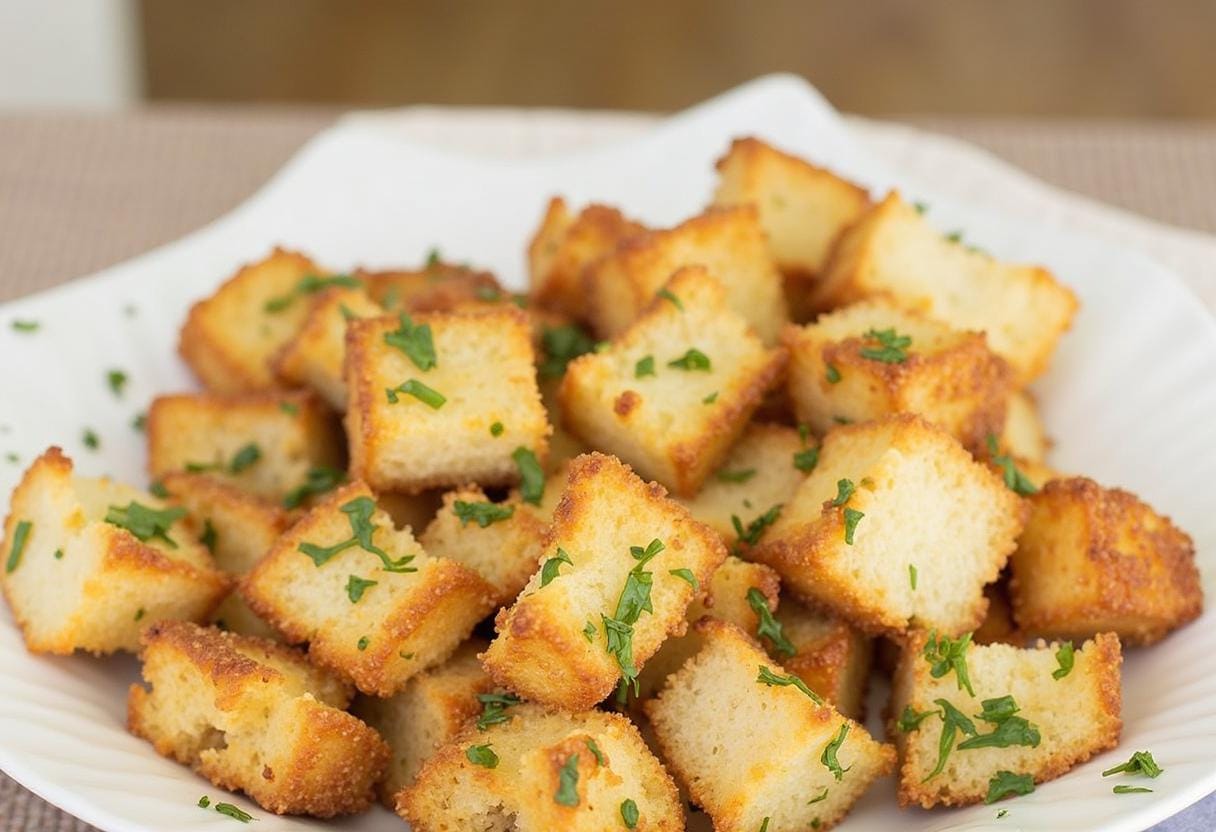 Ti hrustljavi in okusni domači krutoni so popoln dodatek k solatam, juham ali preprosto kot prigrizek. Pripravljeni so hitro, iz ostankov kruha pa ustvarite svežo in zdravo alternativo tistim, kupljenim v trgovini.