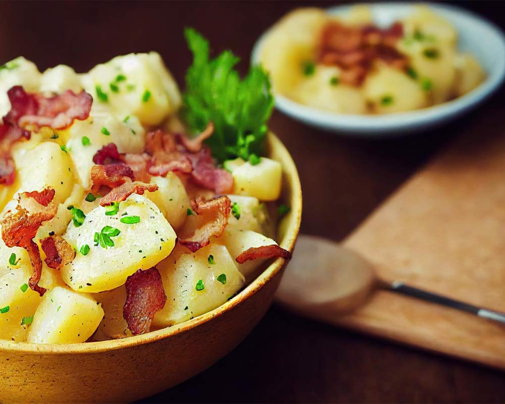 V tej krompirjevi solati je topel gorčični preliv prava zvezda. Med, gorčico, jabolčni kis in začimbe popecite v ponvi, v kateri ste najprej na kratko prepražili slanino, da naredite preliv za krompir. Dimljen okus slanine v kombinaciji z okusom gorčice in kisa dvigne to krompirjevo solato na povsem novo raven. Postrežemo jo lahko hladno ali toplo k pečenemu mesu z žara ali ribam, odlična pa bo tudi sama.