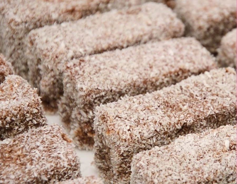 - Vsako kocko biskvita pomočite v vroč čokoladni nadev, nato takoj pomakajte v kokos.