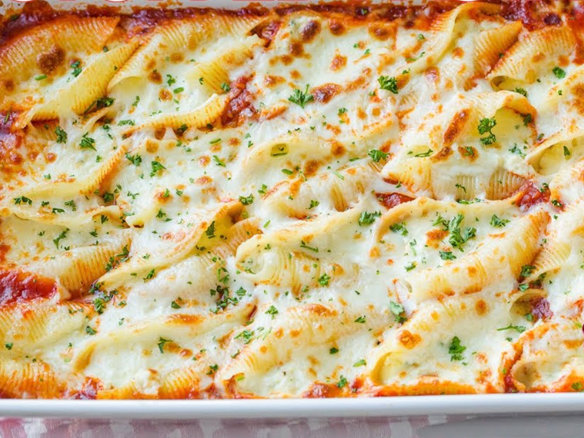 Sočne in okusne testeninske školjke, napolnjene s kremnim nadevom iz rikote, parmezana in mocarele, prelito z dišečo omako.