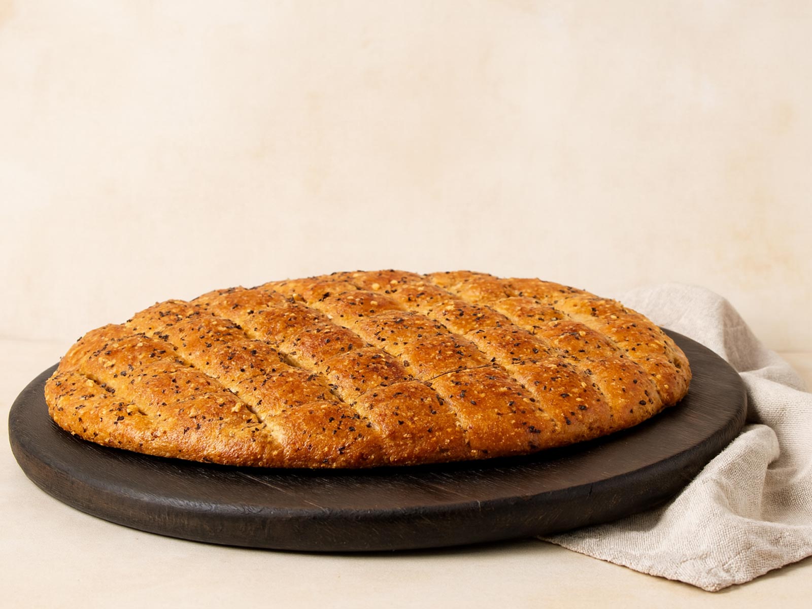 Pecite v predhodno ogreti pečici na 220 °C približno 20–25 minut, dokler ni pogača lepo zlato rjava in visoka 3–4 cm v sredini.