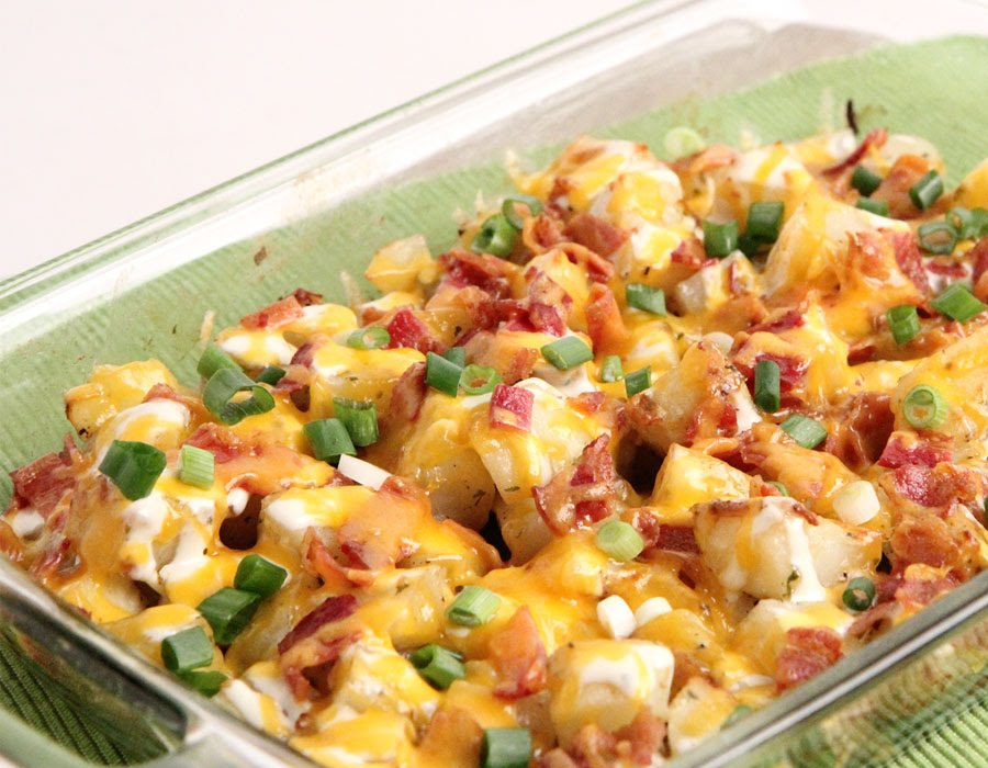 Ta zapečeni krompir je odlična priloga ali celo samostojen obrok, ki bo s svojim bogatim okusom navdušil vso družino. Mehki, zlato zapečeni krompirčki, preliti s kremastim prelivom, obogateni s hrustljavo slanino in prekrasno stopljenim čedarjem, so prava poslastica.