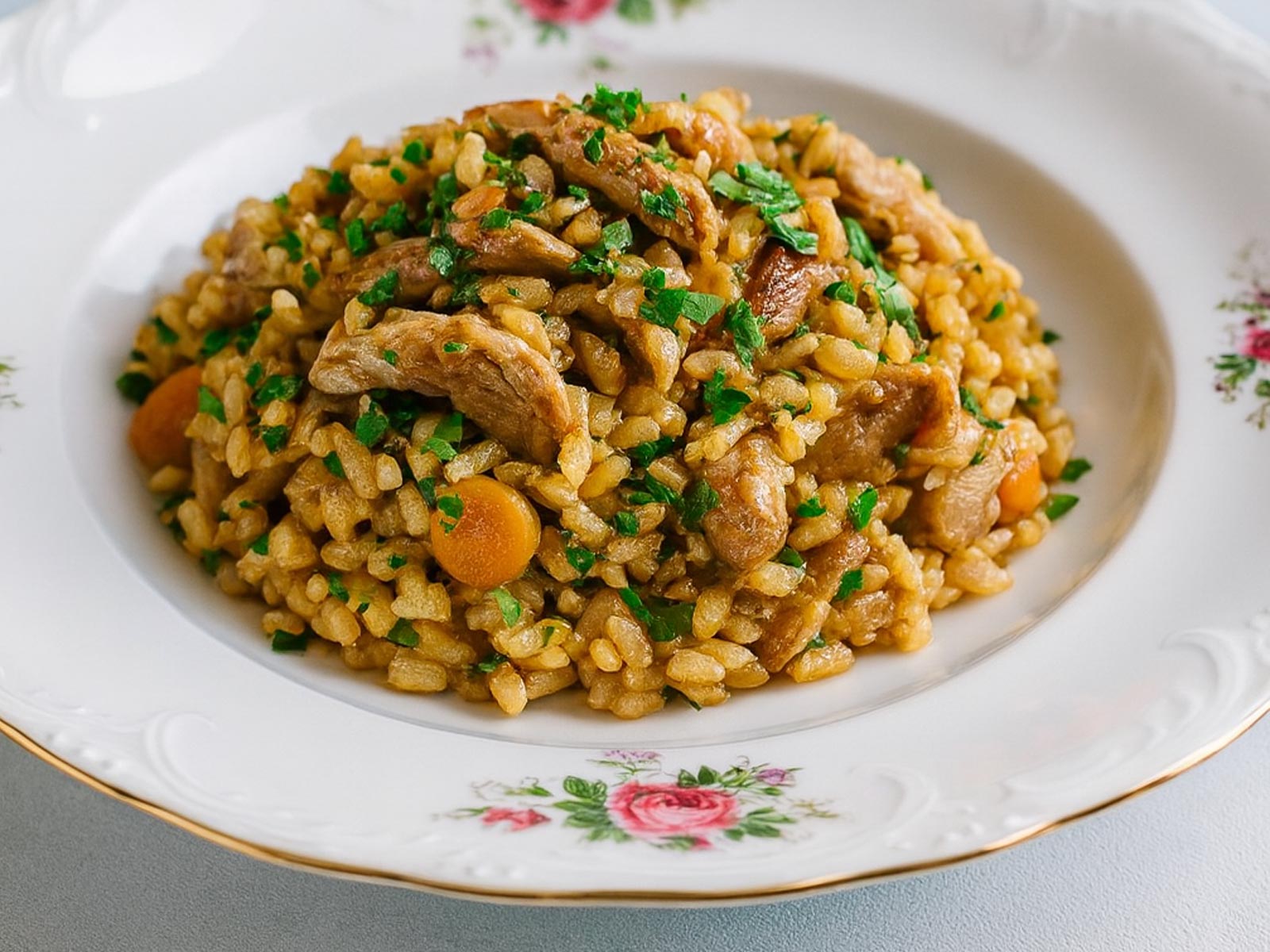 - Kuhanje rižote: Rižoto kuhajte približno 30 minut na srednjem ognju. Med kuhanjem po potrebi dolivajte dodatno juho in pogosto premešajte. Riž naj ostane kuhan al dente, meso pa mehko.