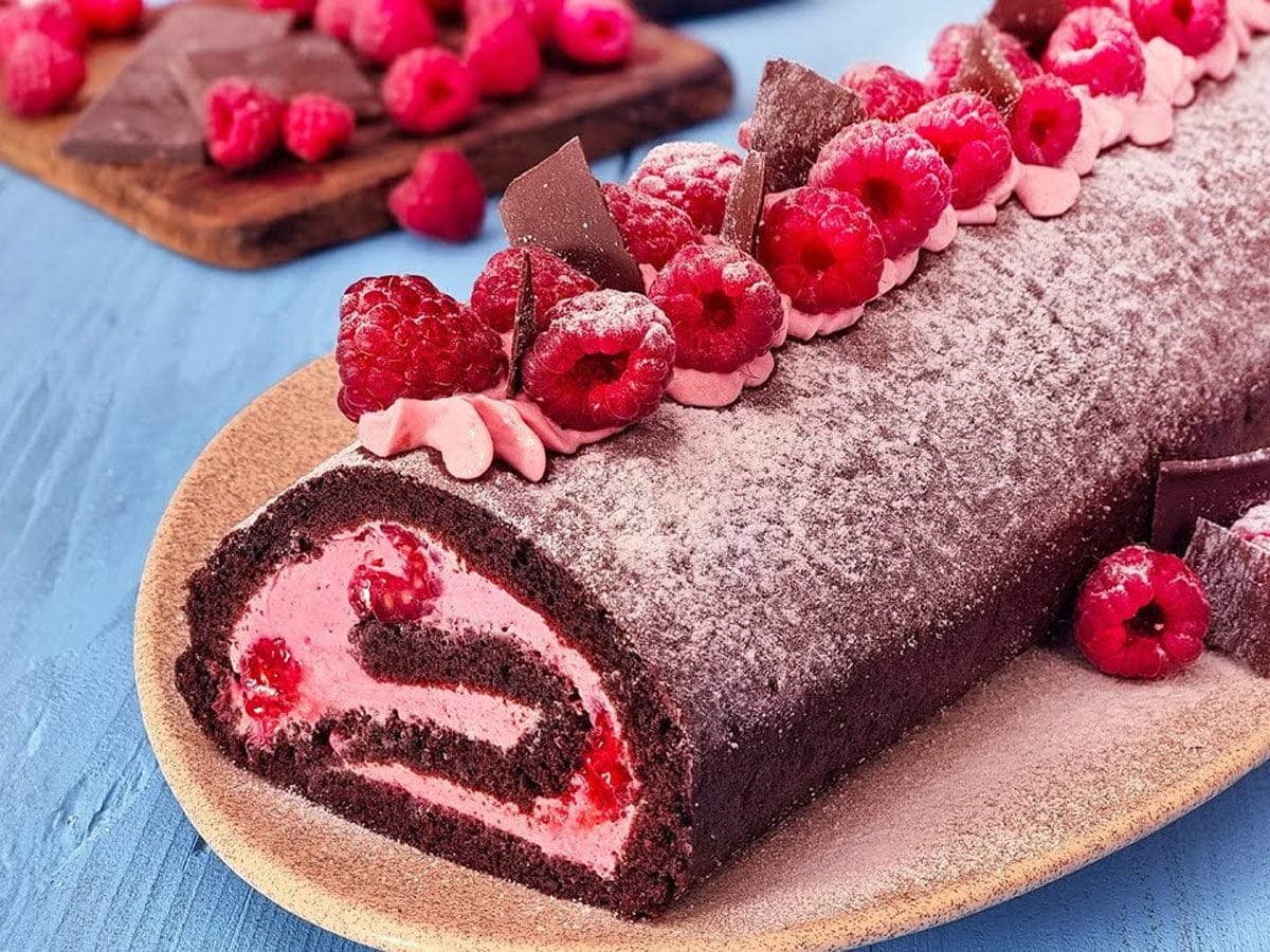 Vsaka rezina te rolade razkriva čudovito spiralo globoke temnega čokoladnega biskvita, pomešanega s svetlim malinovim nadevom, kar ponuja vizualno poslastico, ki je prav tako okusna, kot je videti.