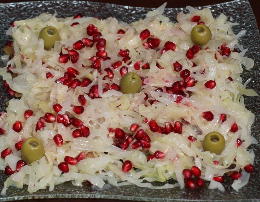 Ta preprosta in osvežilna solata združuje kislost zelja, sladkobo granatnega jabolka in grozdja ter bogat okus oliv in oljčnega olja. Odlična je kot priloga ali lahek obrok, poln vitaminov in antioksidantov.