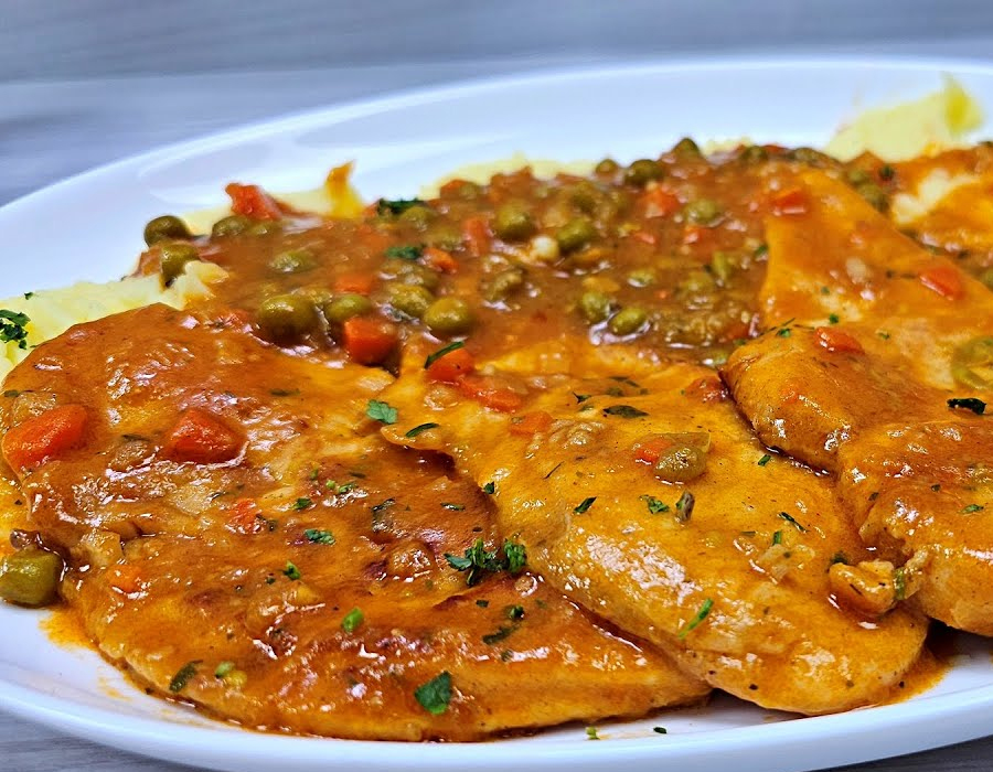 Piščančje prsi v okusni zelenjavni omaki so odlična izbira za hitro, zdravo in okusno kosilo ali večerjo. Kombinacija nežnega piščanca, sočne zelenjave in aromatične paradižnikove omake vas bo navdušila, grah in svež peteršilj pa dodata končni pridih svežine.