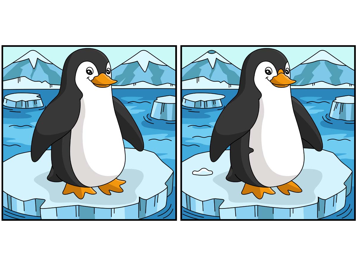 Pred vami sta dve skoraj enaki sliki prikupnega pingvina, ki se zabava v svojem ledenem kraljestvu. A če boste dobro pogledali, boste opazili, da ni vse tako, kot se zdi na prvi pogled! Med slikama se skriva 10 razlik, ki so spretno skrite v podrobnostih. Vaša naloga je, da jih vse odkrijete. Bodite pozorni na vsak zamrznjen košček, vsako plavut in vsak nasmeh – pingvin je zelo navihan!